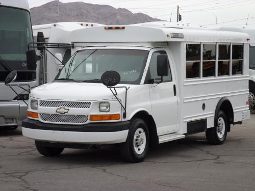 It is set up to transport 14 children or small adults safely with high back vinyl covered bench seats that have 3 point seat belts. It is powered by a 4.8 Liter Vortec V8 gas engine partnered with an automatic transmission with overdrive and tow/haul mode.